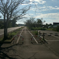 航空写真から予想される沿線図 (赤:枕崎線、黄色:知覧線、青:万世線)